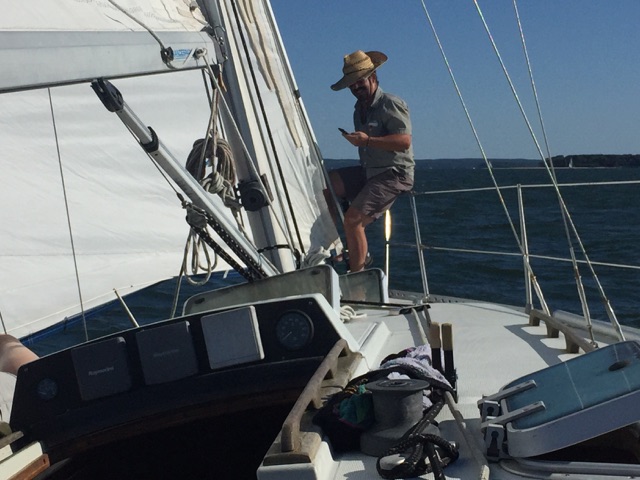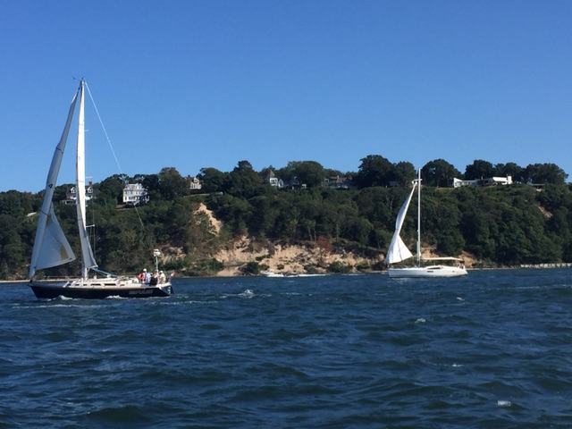 We took our time for the long weekend. Heading out Saturday midday picked up supplies in town, cleaned the boat up and then went for a short afternoon sail. (Low battery slowed our departure, borrowed a battery and started right up) Sunday morning, we drove over to the Springs General Store for coffees & bagels. Grabbed some more supplies from the One Stop in Springs, NY. (Supplies =’s goldfish and beer). And then it was low tide midday, so wait until it was + 0.75 to push off. It was a funny sensation as we didn’t ease out of the slip right away. Had some muddy seafloor to contend with. Our neighbor kept asking me when were departing and if we still planned on the circumnavigation. I was anxious that we were leaving at 1:30 pm and not 10:30 am, which was never going to happen, but was my idea of wake up and go. Anyhow we were off. Headed straight across Gardiner’s towards the light house North of Shelter Island at the Peconic River. Made good time, and we headed into the Peconic. Passing Dering Harbor we were attempting to go basically straight up wind. After being rocked by a few large power boats I started the motor to assist our upwind angle to get around Fanning Point and on our way. We cruised along and had thought of stopping at Sunset beach for the night. It was how i picture greece. Boats everywhere jammed in. And houses littering the hillside. We had daylight left so kept on. Once we cleared Jennings point we flew South. Good lean and we were cruising, turned east and then turned at Tyndal Point and again flying south. Rounded Mashomack point and up to the mouth of Coecles. Passed a big yacht parked outside Coecles as the sun was setting and then found a spot to anchor near shore in Coecles just before dark. We did it! Circumnavigation of Shelter was complete! Next time I want to go clockwise and never touch the engine. Dering Harbor and Greenport and all of that Peconic behind Shelter was garbage for sailing. So many A hole power boats. I don’t know why anyone would keep a sailboat in there. Reaffirmed how happy I am in Three Mile Harbor.