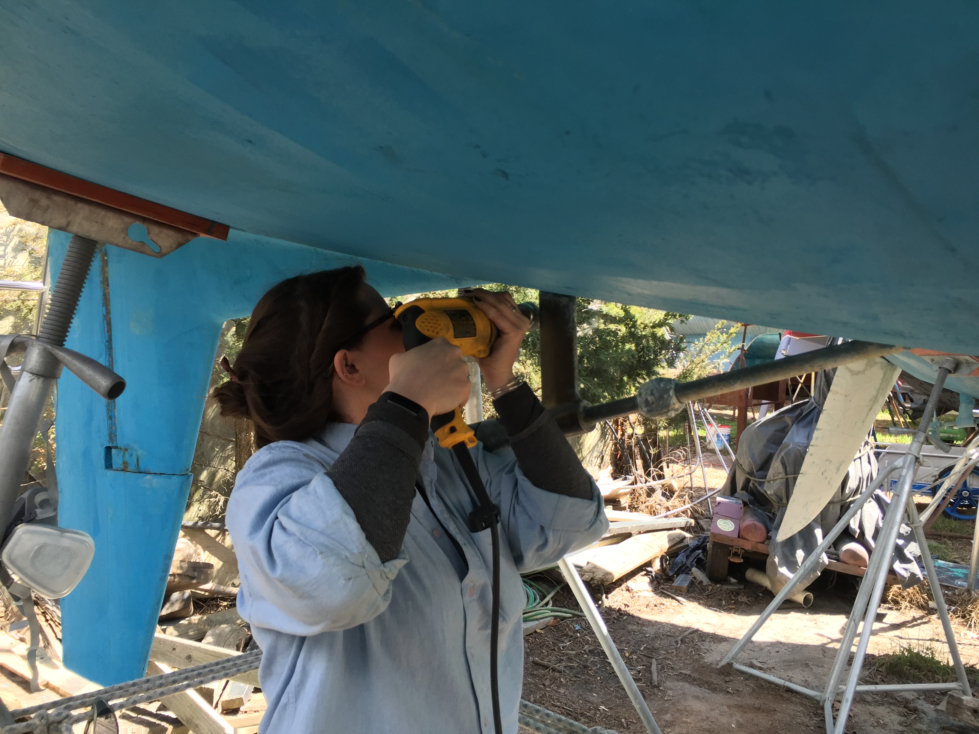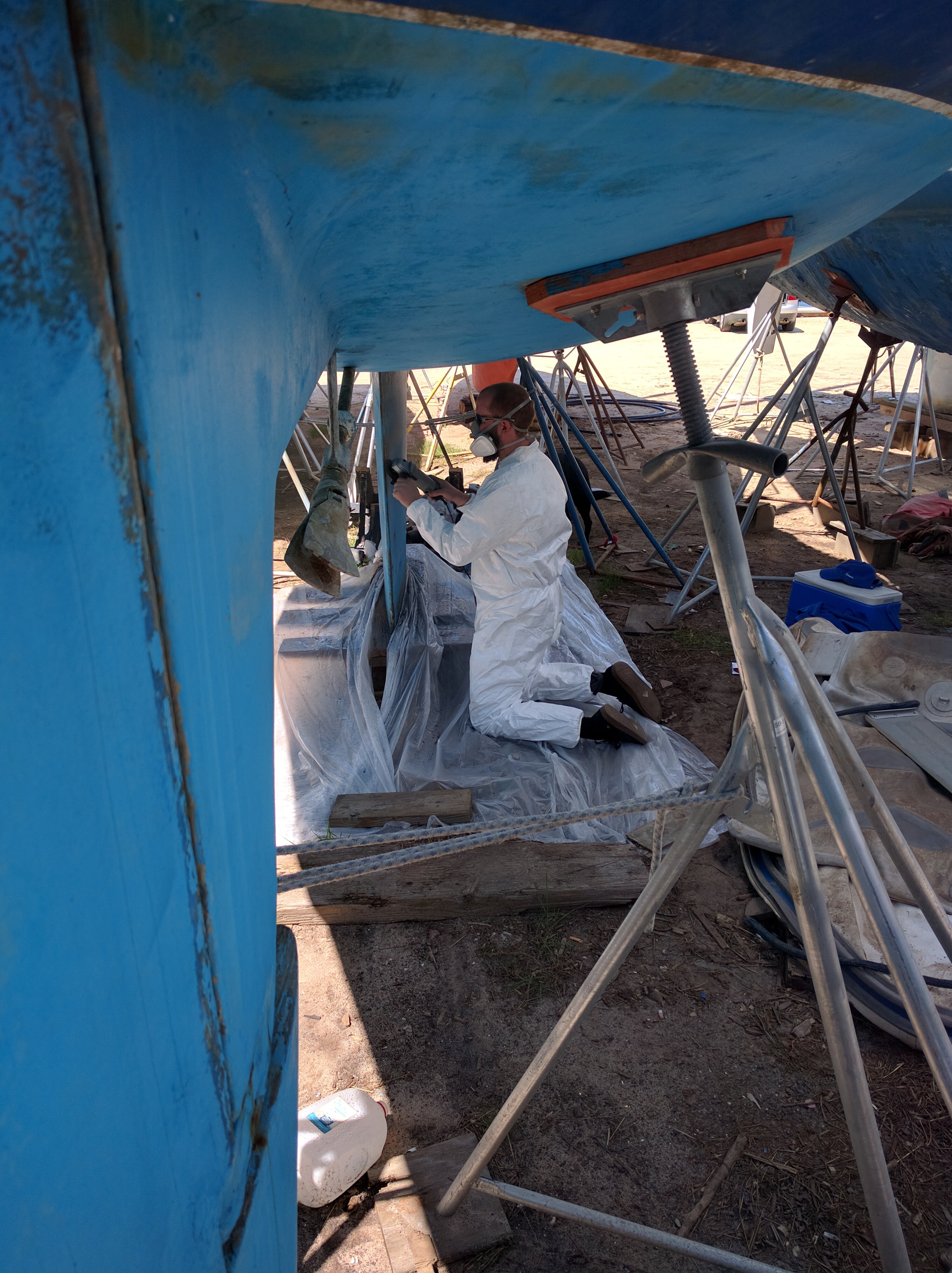 Did a home depot run the day before, so was all set with discs for the angle grinder. Donned the Tyvec suit and took down all of the areas where rust is coming through on the keel. Also cleaned up the prop and inside the boat around the bilge we cleaned off the hardware that bolts on the keel. Will do a little more cleaning up of the area where the keel meets the hull and then will be applying a rust neutralizer, then G FLEX (“With a modulus of elasticity of 150,000 psi”), then a barrier coat and then our bottom paint. And this should last more than a few years. (Fingers crossed). Solid day. Turned my head blue.