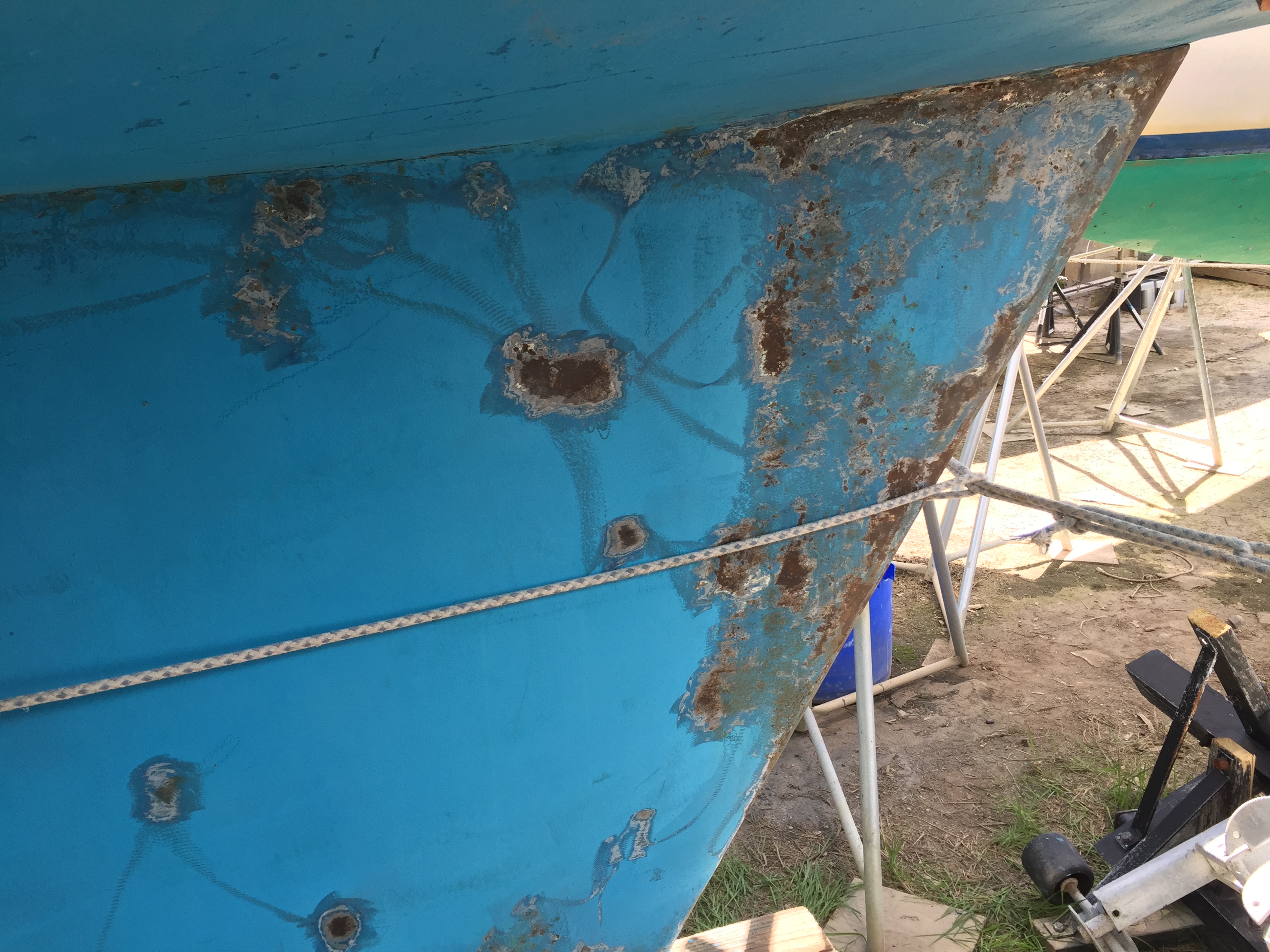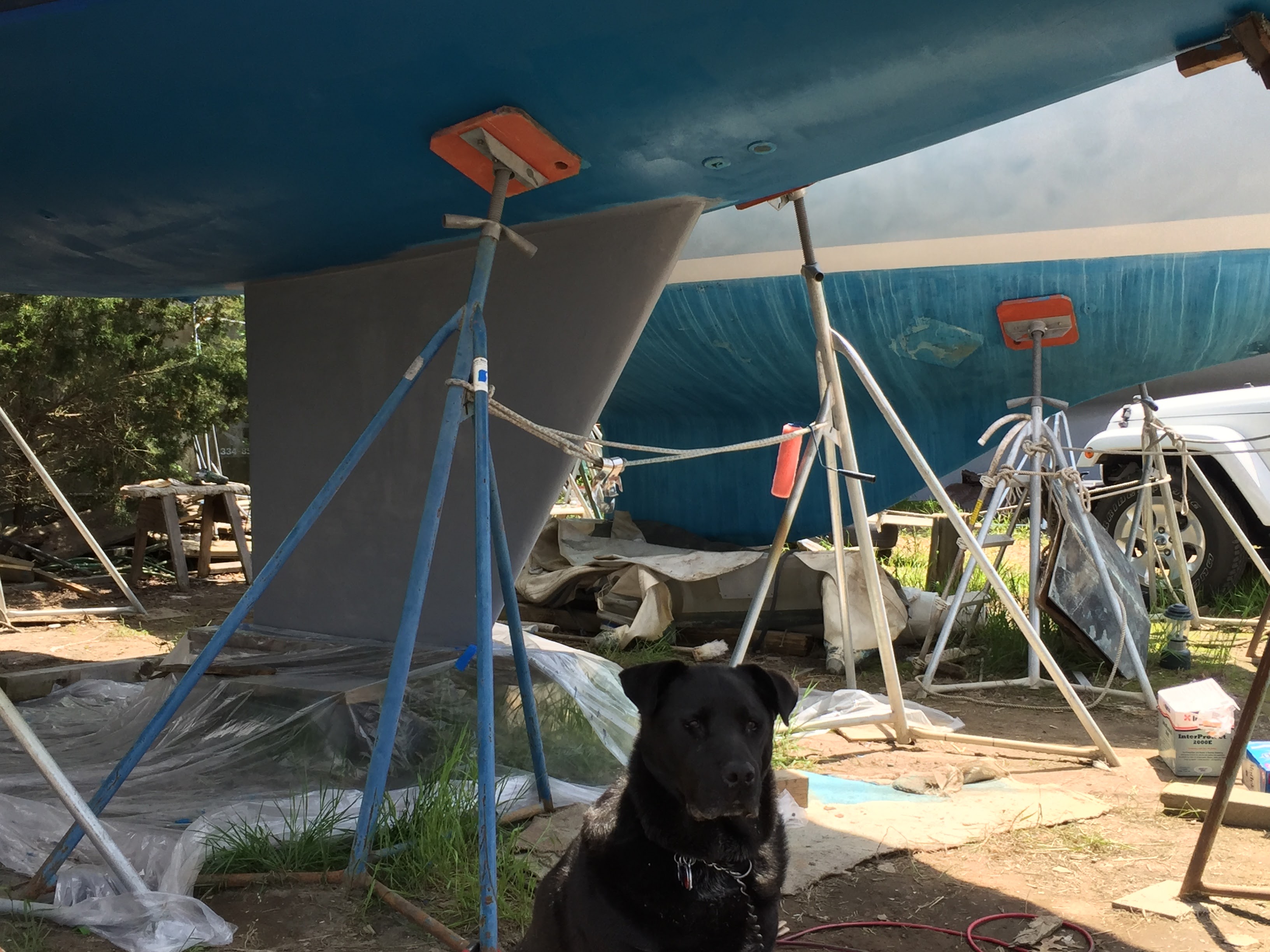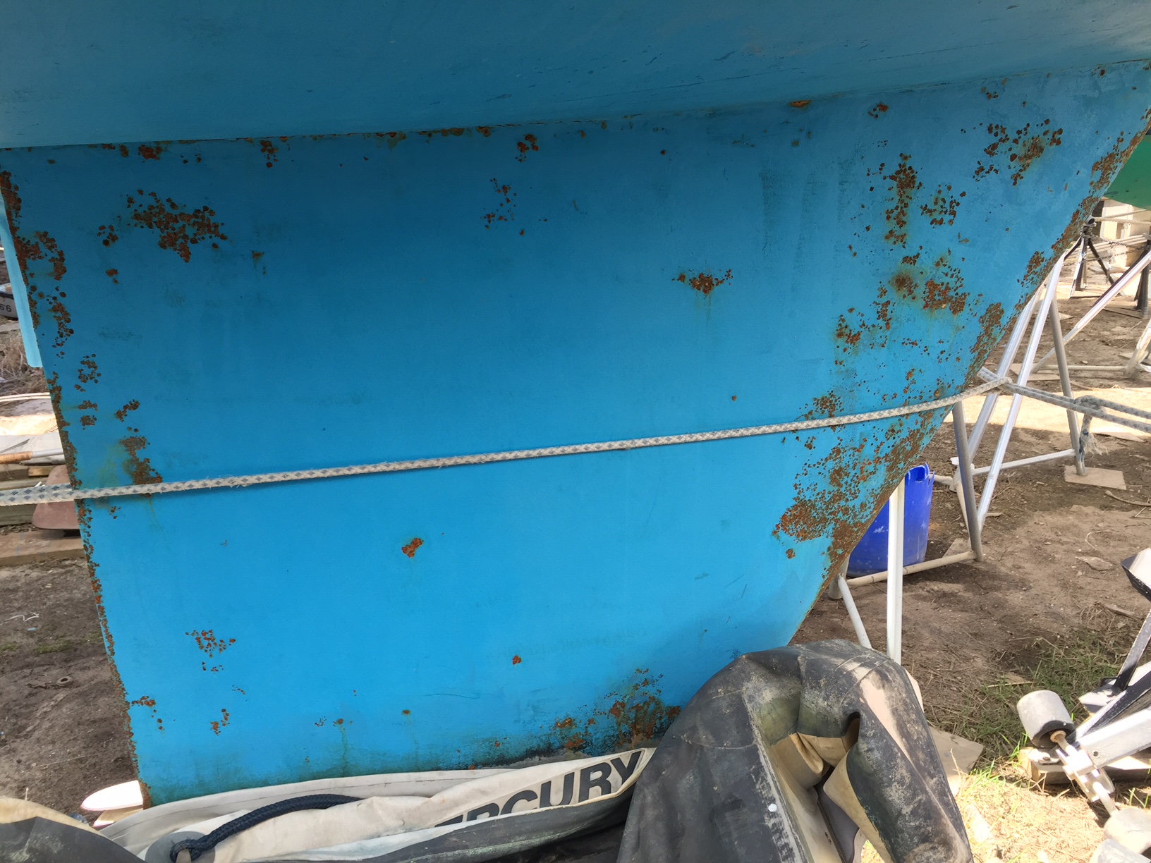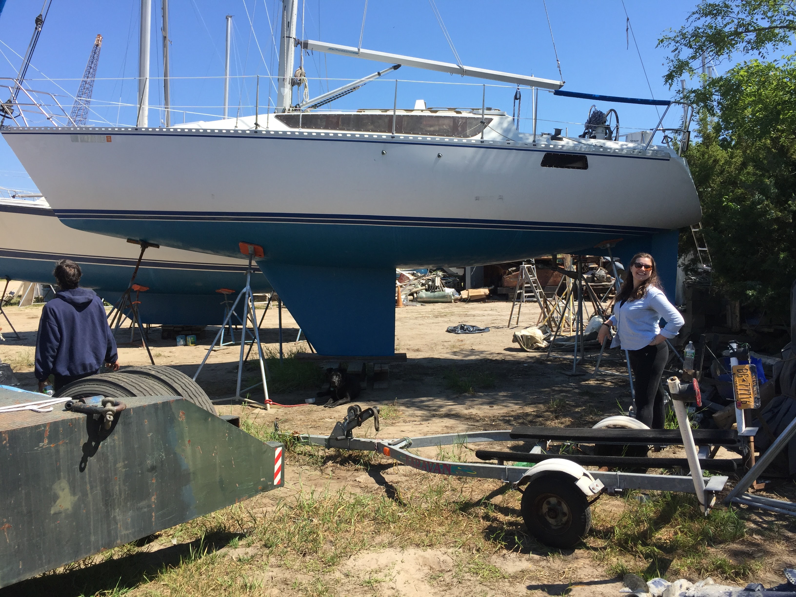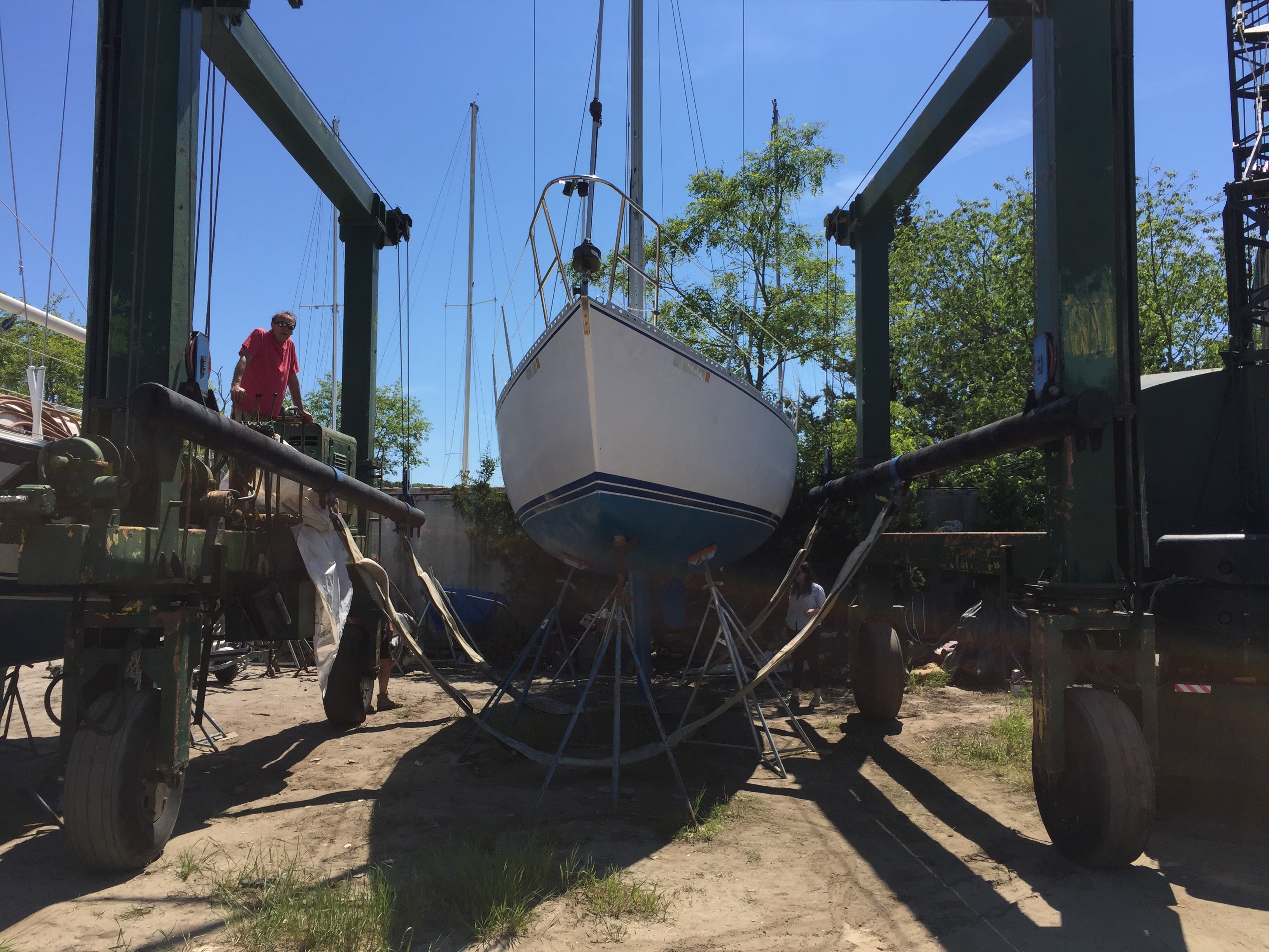 2016 was a wedding onslaught and this site was not updated nearly enough. Going to set the calendar reminders to post Mondays during lunch time for this summer. To get up to speed, so far this year have had 4 weekends out at boat yard. One to mostly survey and clean the hull (esp the water line) with Muriatic acid. And then one big day of angle grinding the keel down to the metal again. (Huge thanks to Joe for helping that day). Then a few rainy weekends so wasn’t going to paint those days. And then a trip out a few weeks later, where used acid to remove rust accumulation. Rinsed. Let it dry. Then applied a lot of Star Brite Rust Eater and Converter. Let that sit for 10 minutes and then went back and applied more and moved around with microfiber cloth to try and get any cracks, etc. Let that dry for 2 hours and then put on a coat of the HS High Solids Barrier coat. Stuff is awesome. Goes on thick. Put on a really thorough coat. And then headed home. Then this last weekend went back out early early and put on another HS barrier coat first thing in the morning. Let dry for 4 hours and taped off the lines and then went with the west marine standard blue anti fouling paint. And then after letting dry. The boat is in the water. Now the fun stuff can begin. This coming weekend we want to take out any wood not attached and sand and seal and put back. Also want to remove decayed wheel leather and thinking of going with thin cord neatly knotted over and over all the way around the wheel instead of foam and leather.